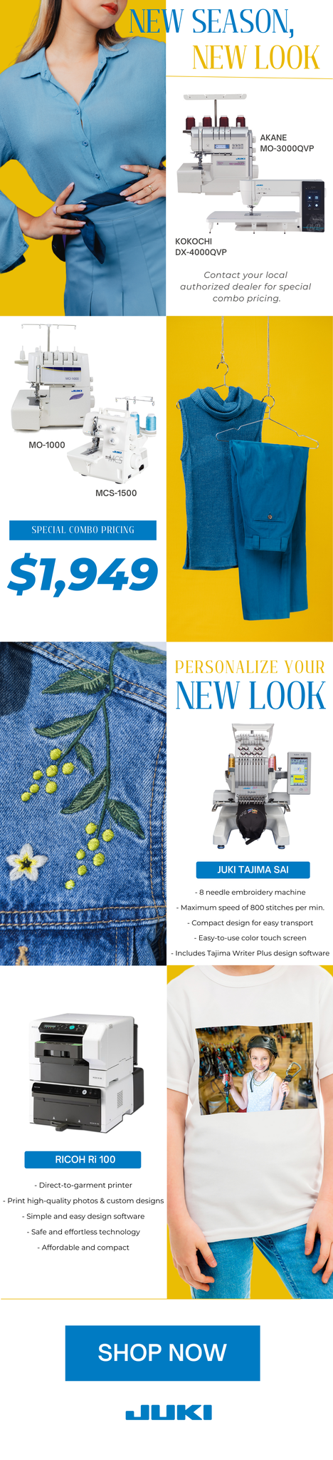 Get ready for a new season with a new look using JUKI! Whether you're creating a new jacket, a dress for a night out on the town, or a swimsuit for the sunny days approaching, our JUKI machines are ready to help bring your projects to life. Enjoy the Season, and give yourself a new look!