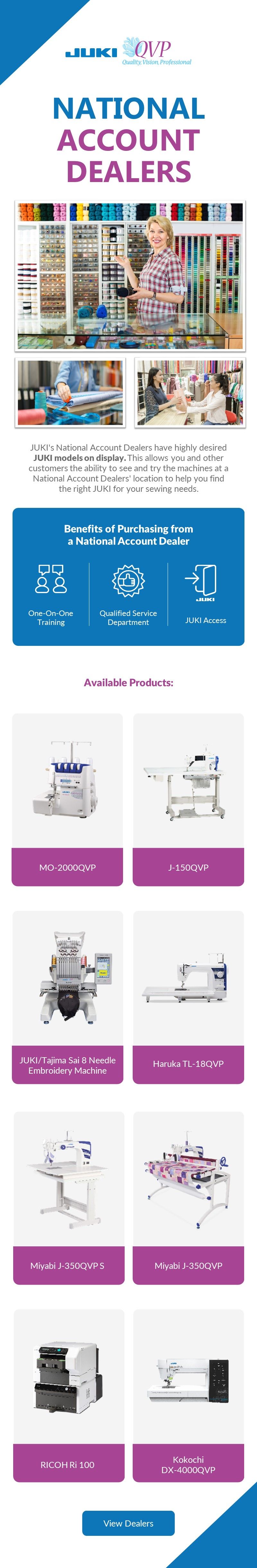 JUKI's National Account Dealers have highly desired JUKI models on display. This allows you and other customers the ability to see and try the machines at a National Account Dealer location to help you find the right JUKI for your sewing needs.