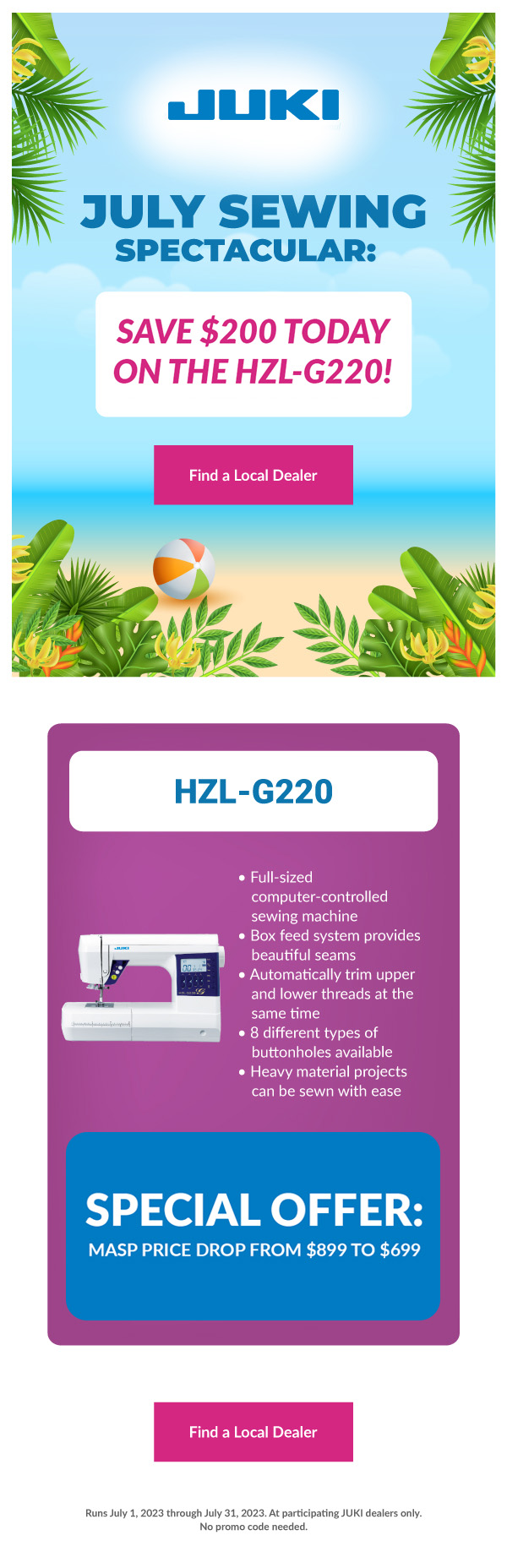 Don’t miss your chance this month and visit your nearest JUKI dealer to learn about our HZL-G220 special! Save $200 this month only and discover all the amazing projects you can begin creating with this series.