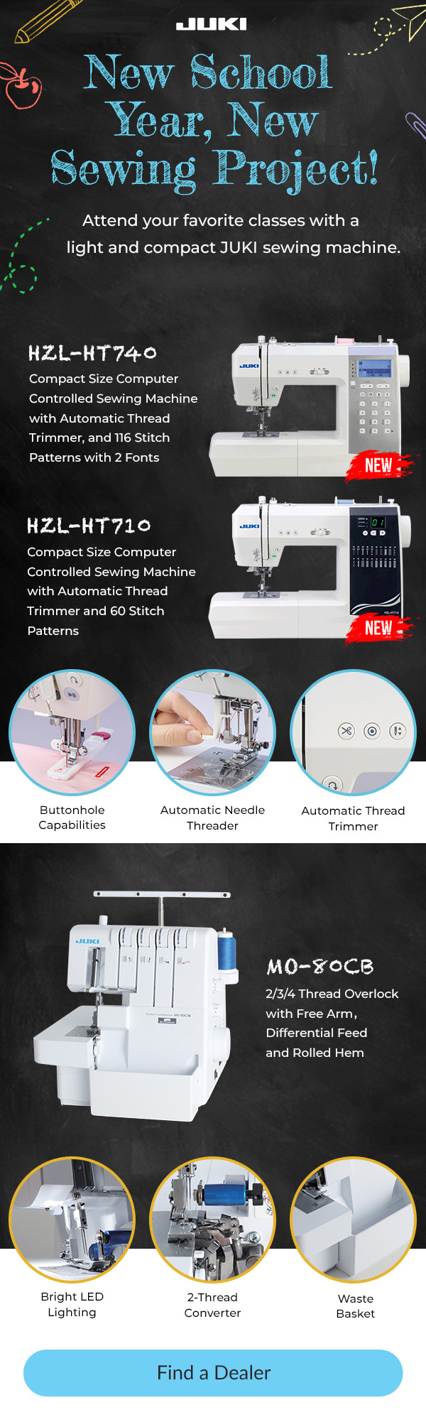 Attend your favorite classes with a light and compact JUKI computerized sewing machine and overlock serger!