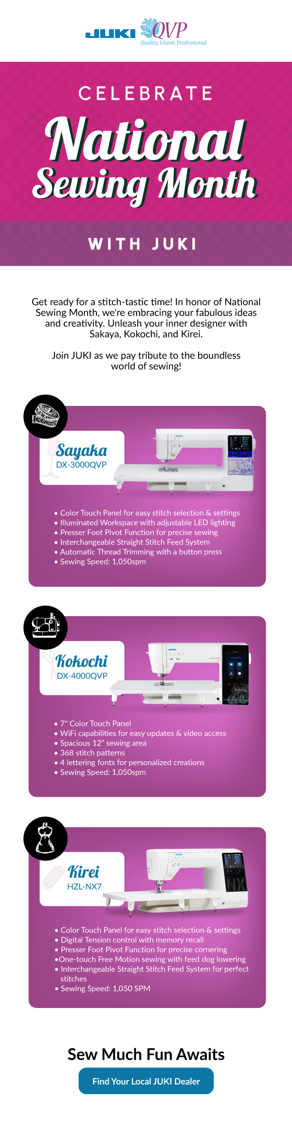Join us in celebrating National Sewing Month and discover the joy of bringing your visions to life stitch by stitch. Whether you sew for passion, profession, or relaxation, JUKI has the perfect companion for your creative endeavors.